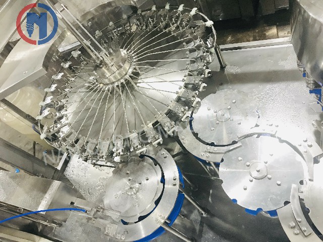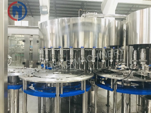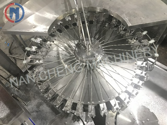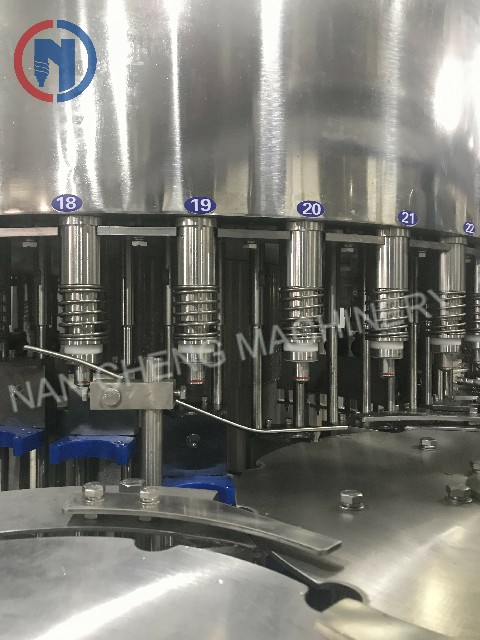 2、灌裝機(jī)采用新一代不銹鋼翻轉(zhuǎn)式瓶夾,使鉗夾與瓶口螺紋以上部分不接觸,并設(shè)有噴頭,使瓶內(nèi)壁沖洗充分、無死角。