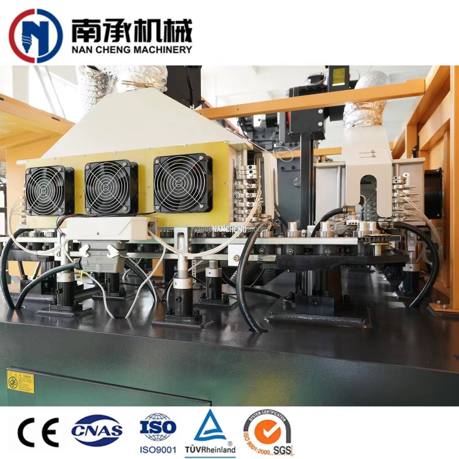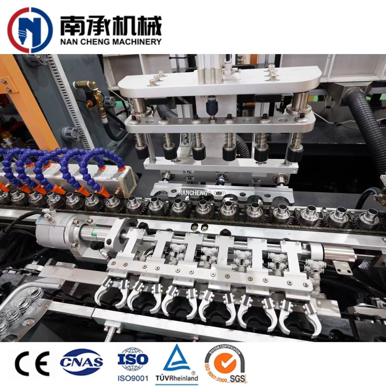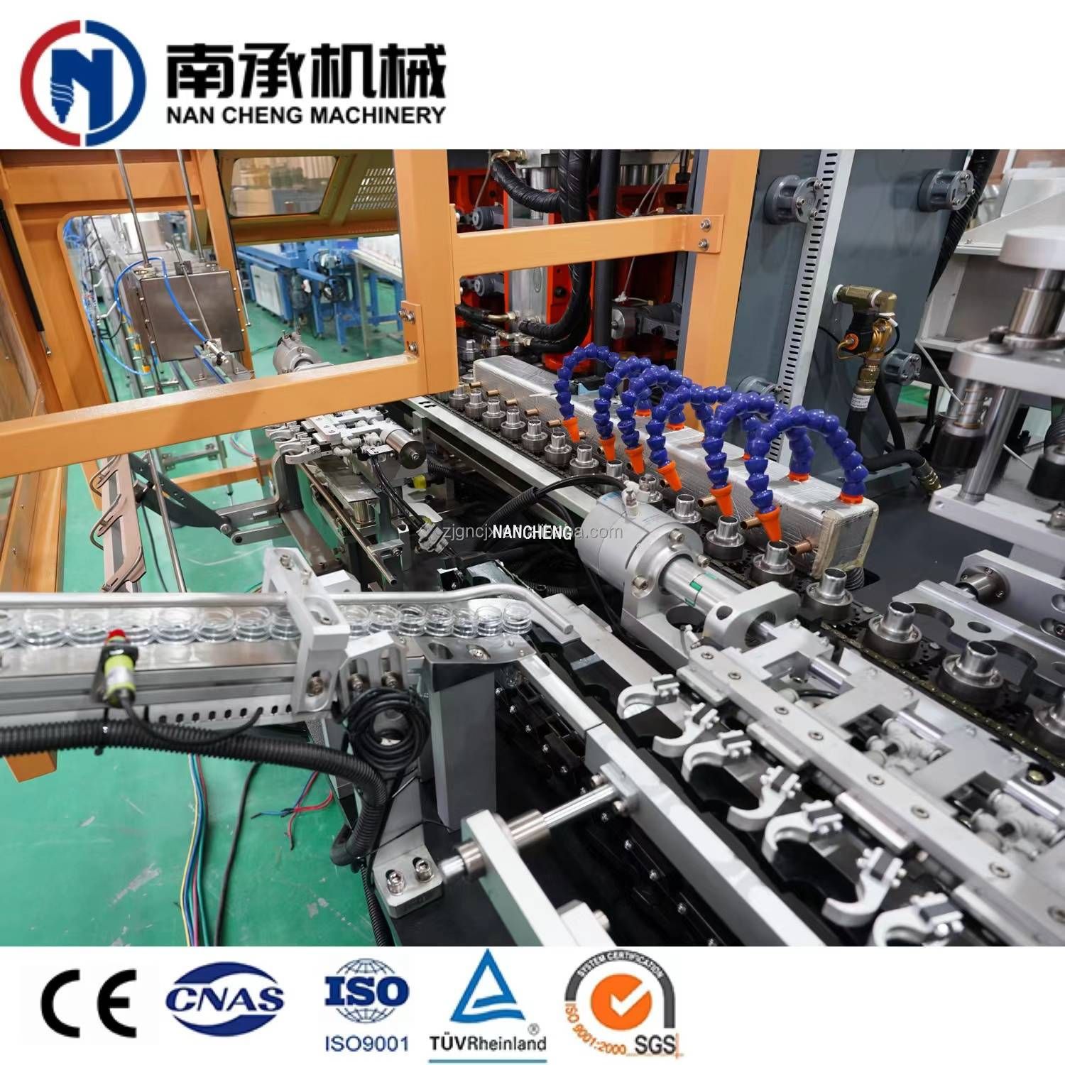 將瓶坯(胚)通過紅外線高溫燈管照射,將瓶坯(胚)的坯(胚)體部分加熱軟化,為了保持瓶口形狀,瓶坯(胚)口是不需要加熱的,因此需要一定的冷卻裝置對其進行冷卻操作。