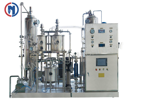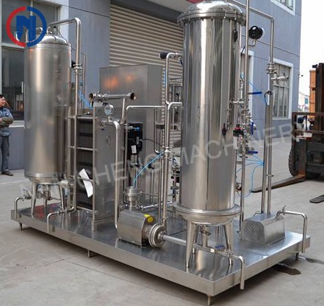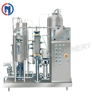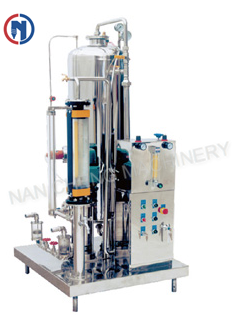 其工藝過程為:糖漿和凈水經(jīng)配比器按比例進入混合罐混合,用泵輸入碳酸化罐,在碳酸化罐內(nèi)裝有管,罐內(nèi)通有制冷劑、使混合后的物料冷卻,以融入足夠的二氧化碳。為保證二氧化碳與處理水有足夠的接觸時間,二氧化碳從進入碳酸化罐之間就開始充入。碳酸化后的物料進入灌裝機,然后灌入容器中張家港市南承機械有限公司
